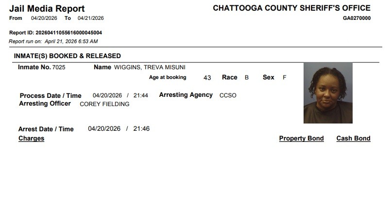 Here is the latest arrest report from the Chattooga County Sheriff’s Office for Monday, April 20, 2026: