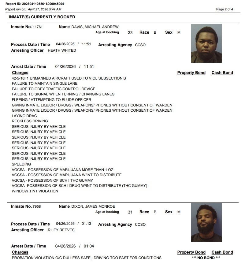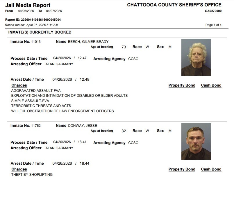 Here is the latest arrest report from the Chattooga County Sheriff’s Office for Monday, April 27, 2026: