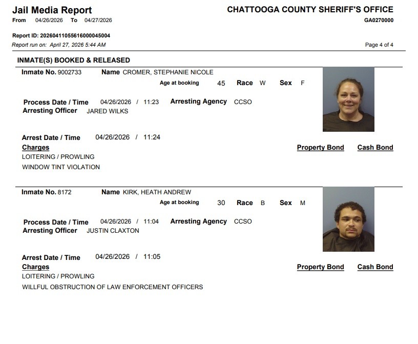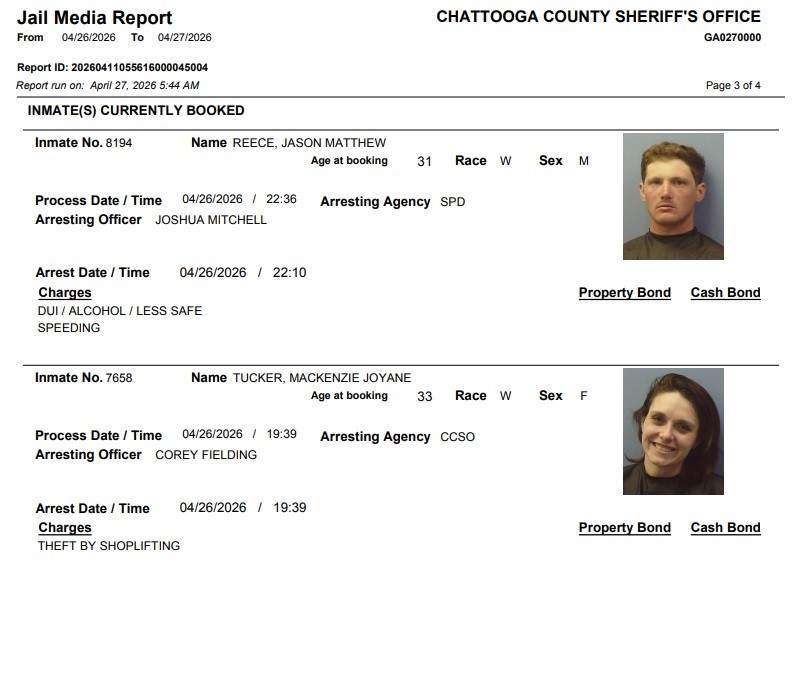 Here is the latest arrest report from the Chattooga County Sheriff’s Office for Sunday, April 26, 2026: