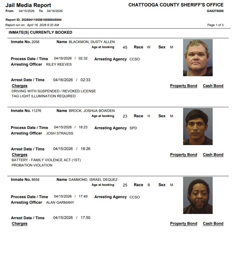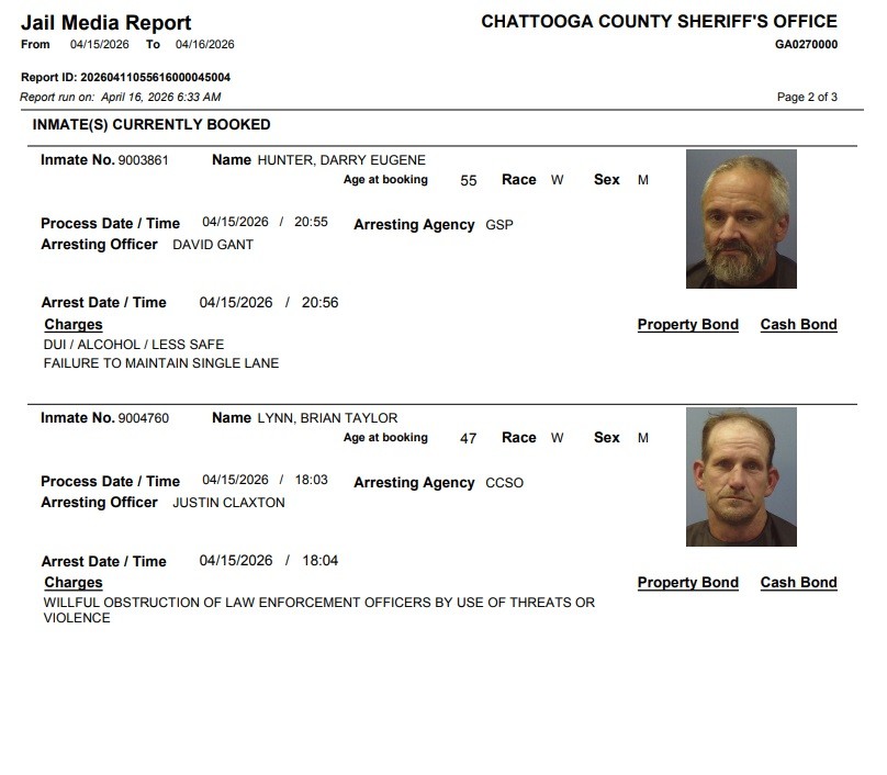 Here is the latest arrest report from the Chattooga County Sheriff’s Office for Thursday, April 16, 2026: