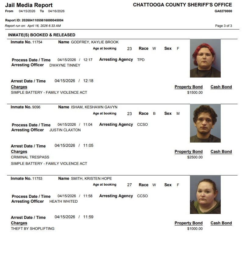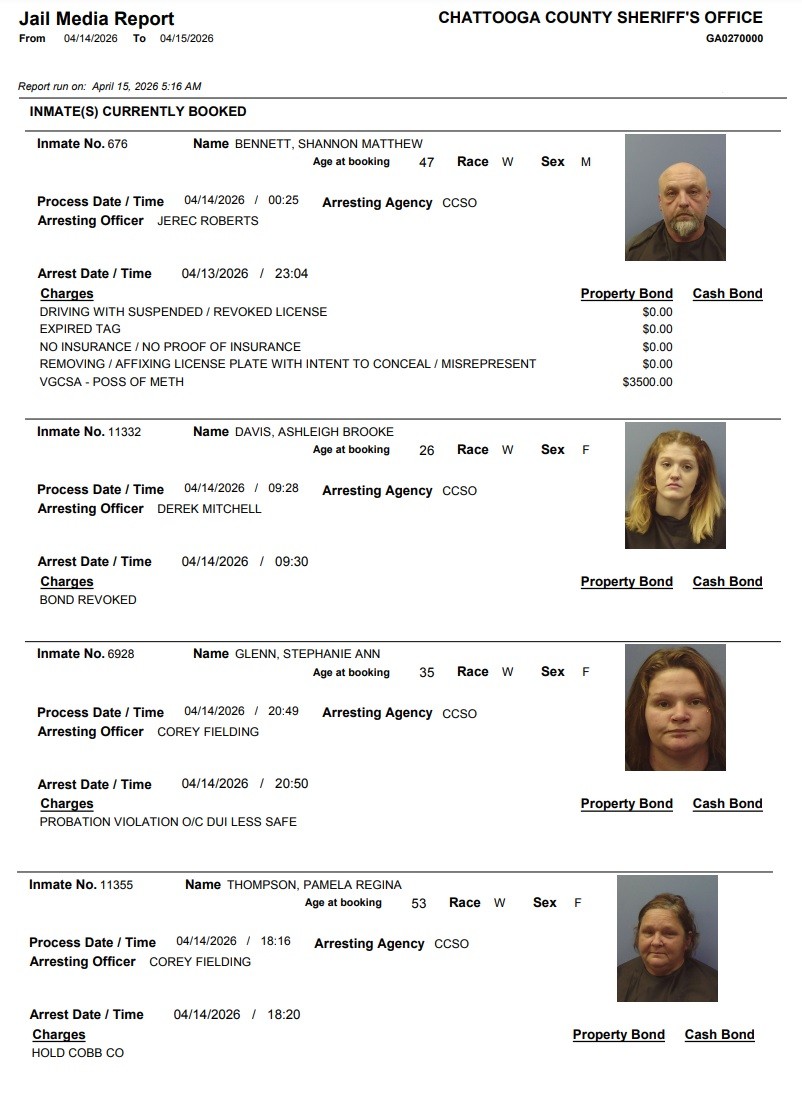 Here is the latest arrest report from the Chattooga County Sheriff’s Office for Wednesday, April 15, 2026: