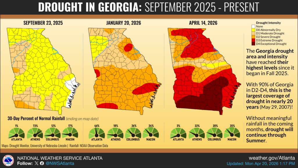 According to the National Weather Service in Atlanta, drought conditions have steadily worsened since last fall. Maps comparing conditions from September 2025 to now show a dramatic expansion of dry conditions, with nearly the entire state now impacted.