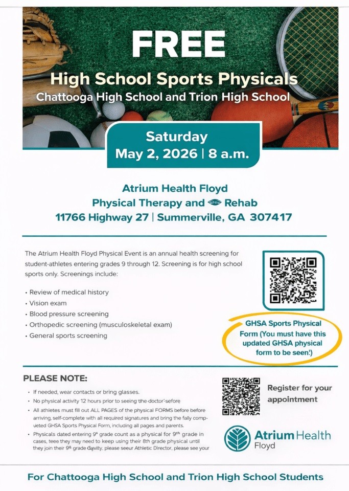Student-athletes at Chattooga High School and Trion High School will have an opportunity to receive free sports physicals ahead of the upcoming school year.
