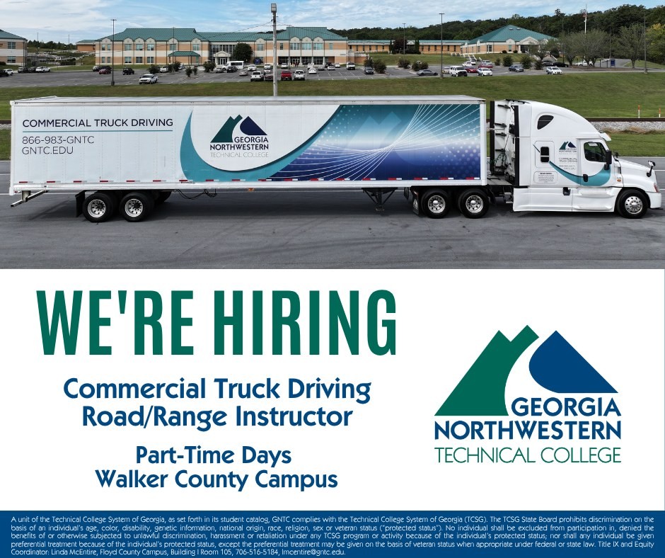 Georgia Northwestern Technical College is now accepting applications for a part-time Commercial Truck Driving Road/Range Instructor at its Walker County Campus.