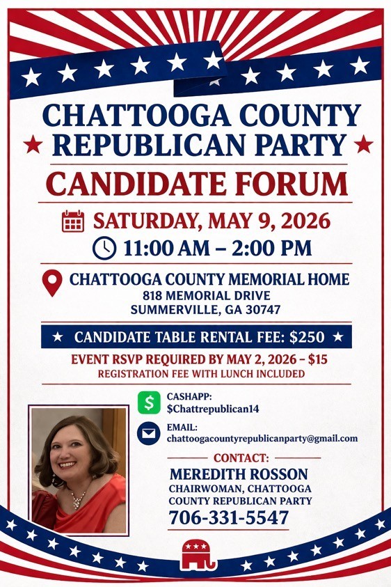 For more information, contact Chattooga County Republican Party Chairwoman Meredith Rosson at 706-331-5547 or by email at chattoogacountyrepublicanparty@gmail.com.