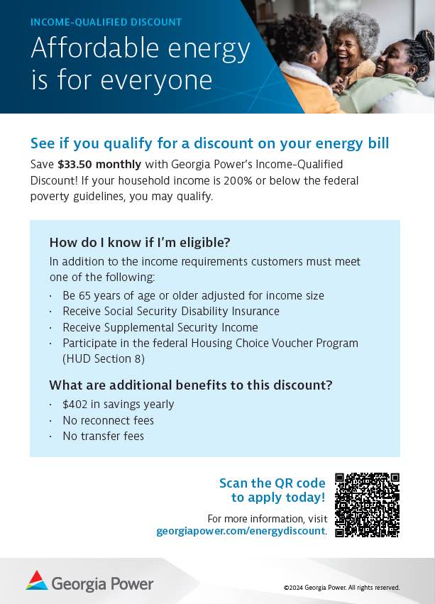 Customers interested in the discount can apply online by visiting georgiapower.com/energydiscount or by scanning the QR code on Georgia Power program materials.