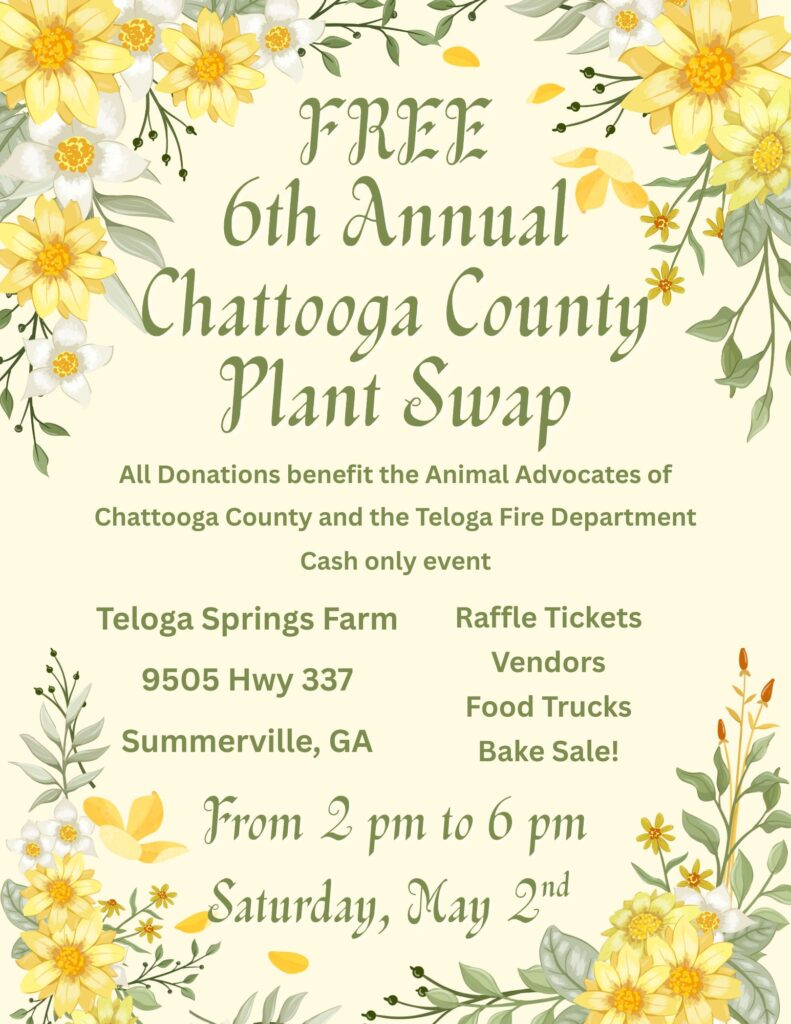 The 6th Annual Chattooga County Plant Swap is scheduled for Saturday, May 2nd from 2 to 6 p.m. at Teloga Spring Farm, located at 9505 Highway 337 in Summerville.