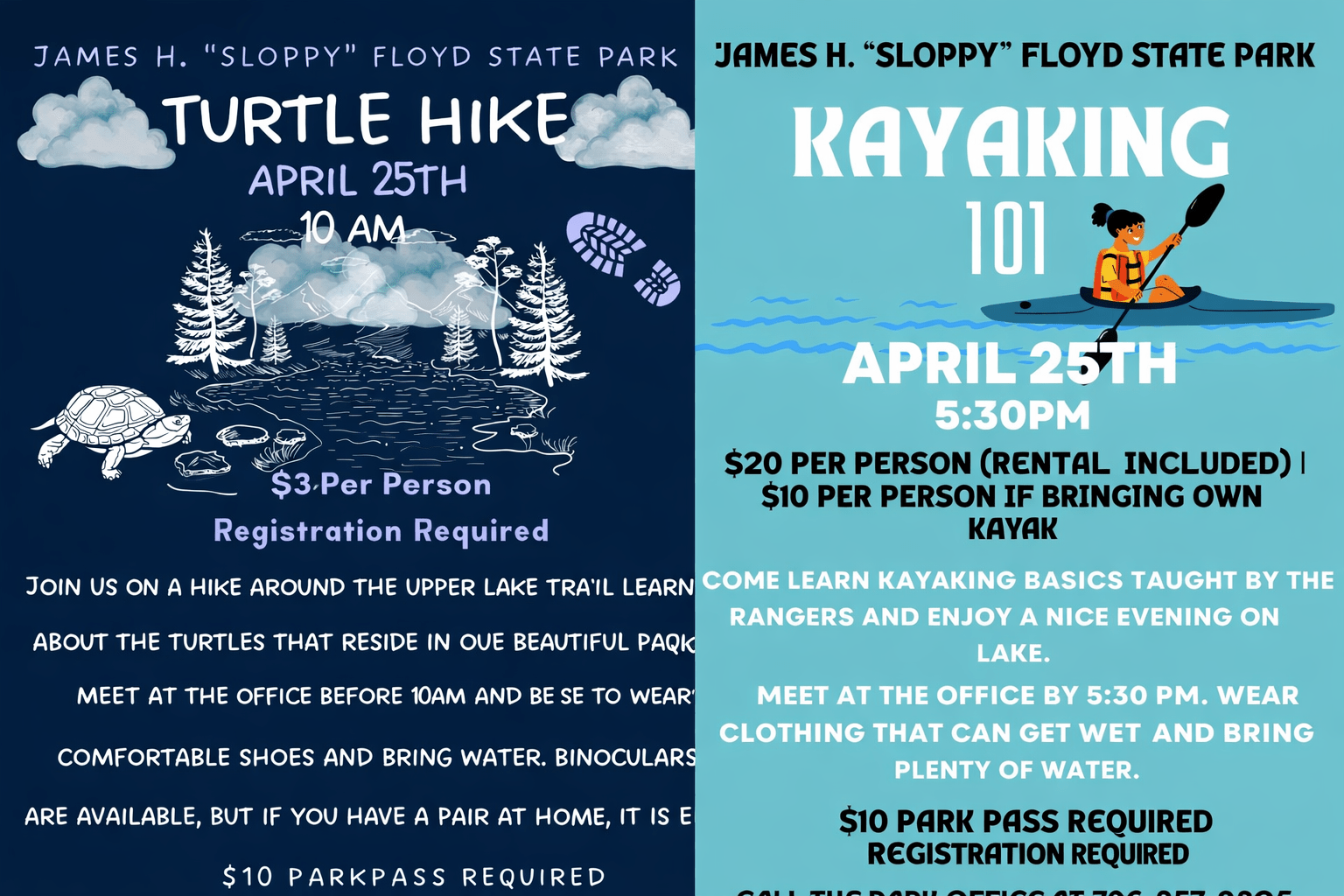 Outdoor enthusiasts will have a couple of opportunities to enjoy nature this weekend at James H. “Sloppy” Floyd State Park, with two ranger-led events scheduled for Saturday, April 25.
