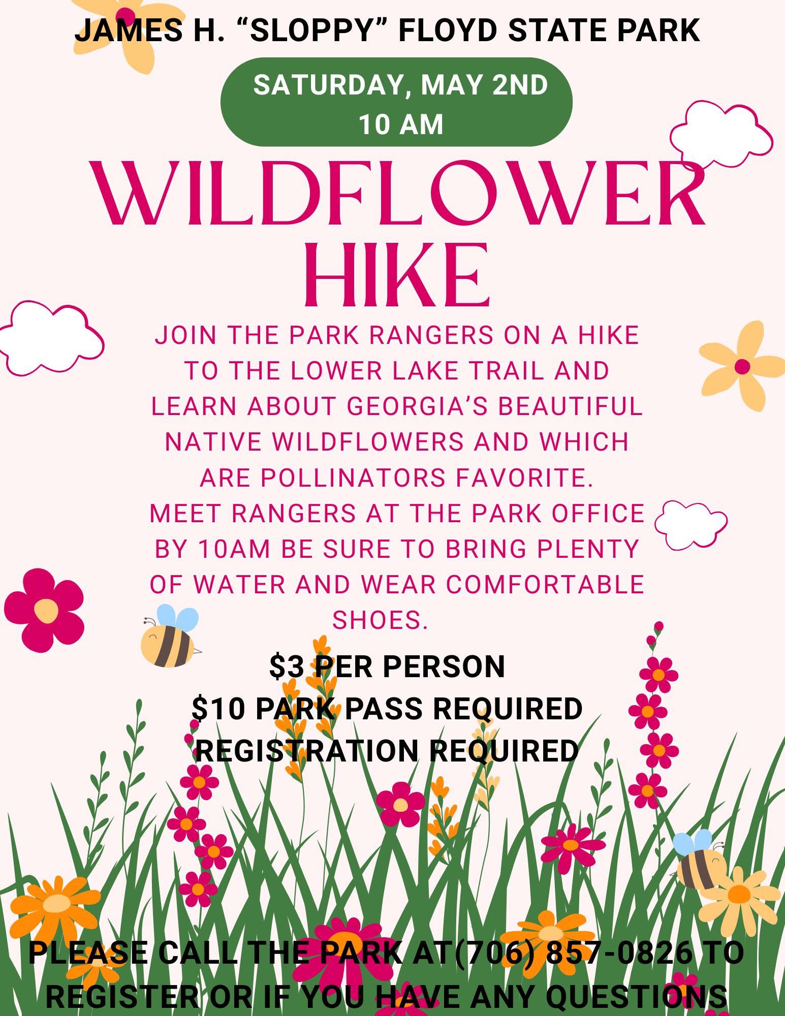 The guided hike will begin at 10 a.m., with park rangers leading visitors along the Lower Lake Trail. Participants will learn about Georgia’s native wildflowers and which species are most important to pollinators.