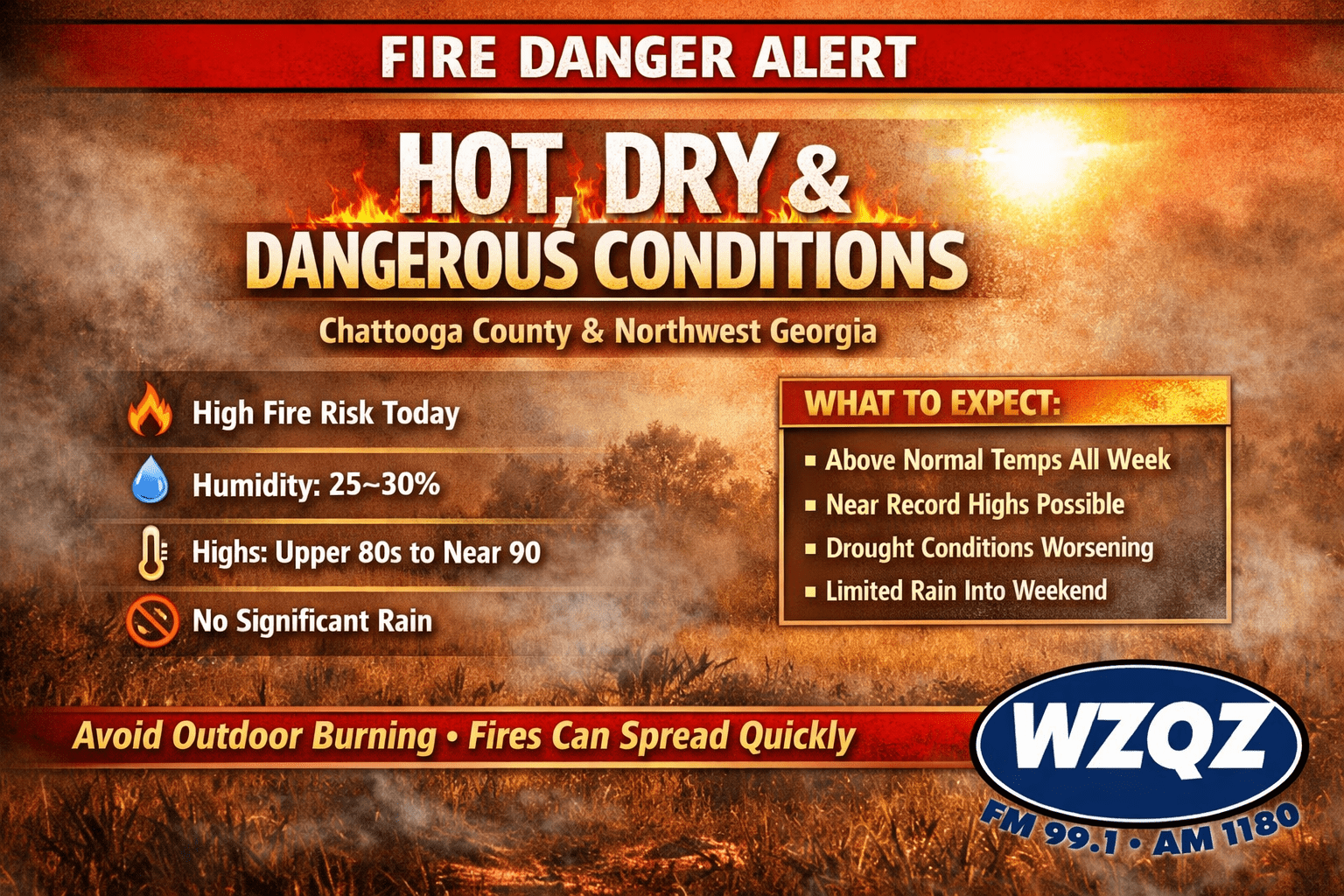 Residents across Chattooga County and Northwest Georgia are being urged to avoid outdoor burning and use extreme caution with anything that could create a spark. Officials say even without strong winds, the dry conditions can allow fires to spread quickly.
