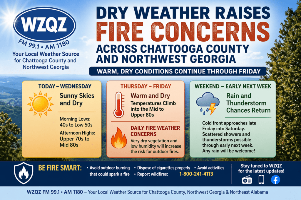 Dry air, clear skies, and gradually warming temperatures are creating dangerous fire weather conditions across Chattooga County and Northwest Georgia today, with concerns expected to continue through the rest of the work week.